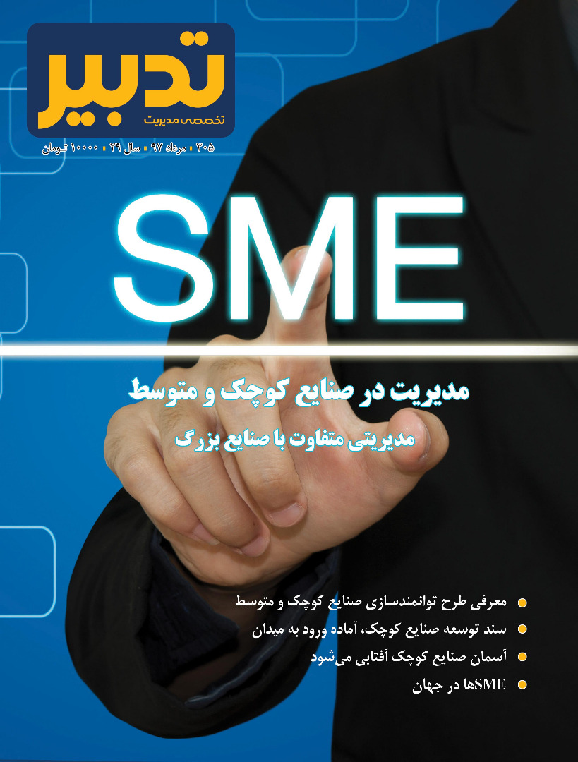 مدیریت در صنایع کوچک و متوسط، مدیریتی متفاوت با صنایع بزرگ ، معرفی طرح توانمندسازی صنایع کوچک و متوسط ‌، سند توسعه صنایع کوچک، آماده ورود به میدان ، آسمان صنایع کوچک آفتابی می شود و SME ها در جهان و ...ازموضوعاتی است که در این شماره ماهنامه تدبیر بدان پرداخته شده است .