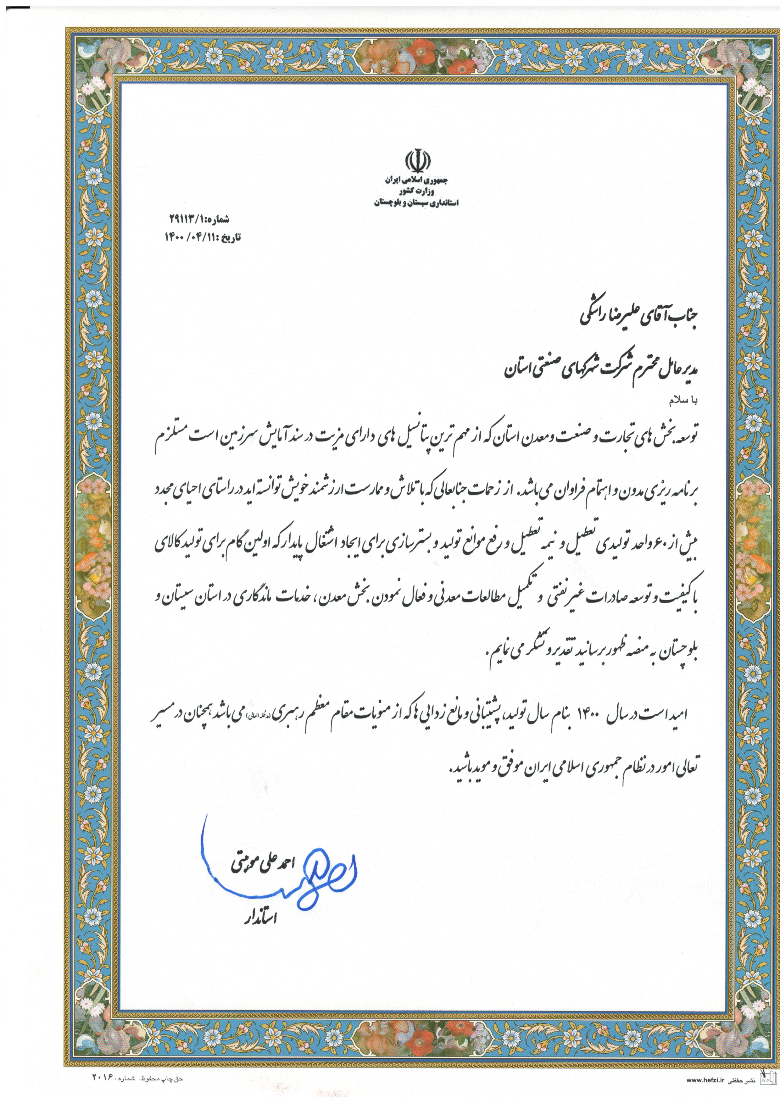 تقدیر استاندار سیستان و بلوچستان از مدیر عامل شرکت شهرکهای صنعتی