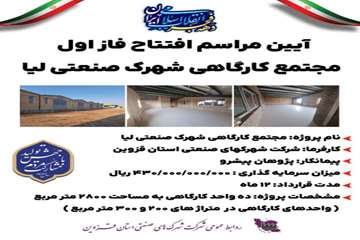 معاون وزیر صمت و مدیرعامل سازمان صنایع کوچک و شهرک‌های صنعتی ایران در ادامه سفر به استان قزوین، فاز نخست مجتمع کارگاهی شهرک صنعتی لیا را مورد افتتاح قرار داد.