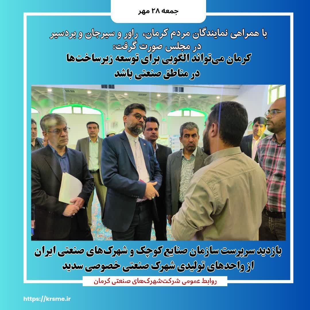 سرپرست سازمان صنایع کوچک و شهرک‌های صنعتی ایران در این بازدید با بیان توانایی الگوسازی کرمان‌ در فعالیت‌های زیرساختی گفت: کرمان در توسعه فعالیت‌های زیرساختی در مناطق صنعتی در بخش خصوصی می‌تواند به عنوان یک الگو باشد و این الگوسازی به سراسر کشور توسعه پیدا کند.
