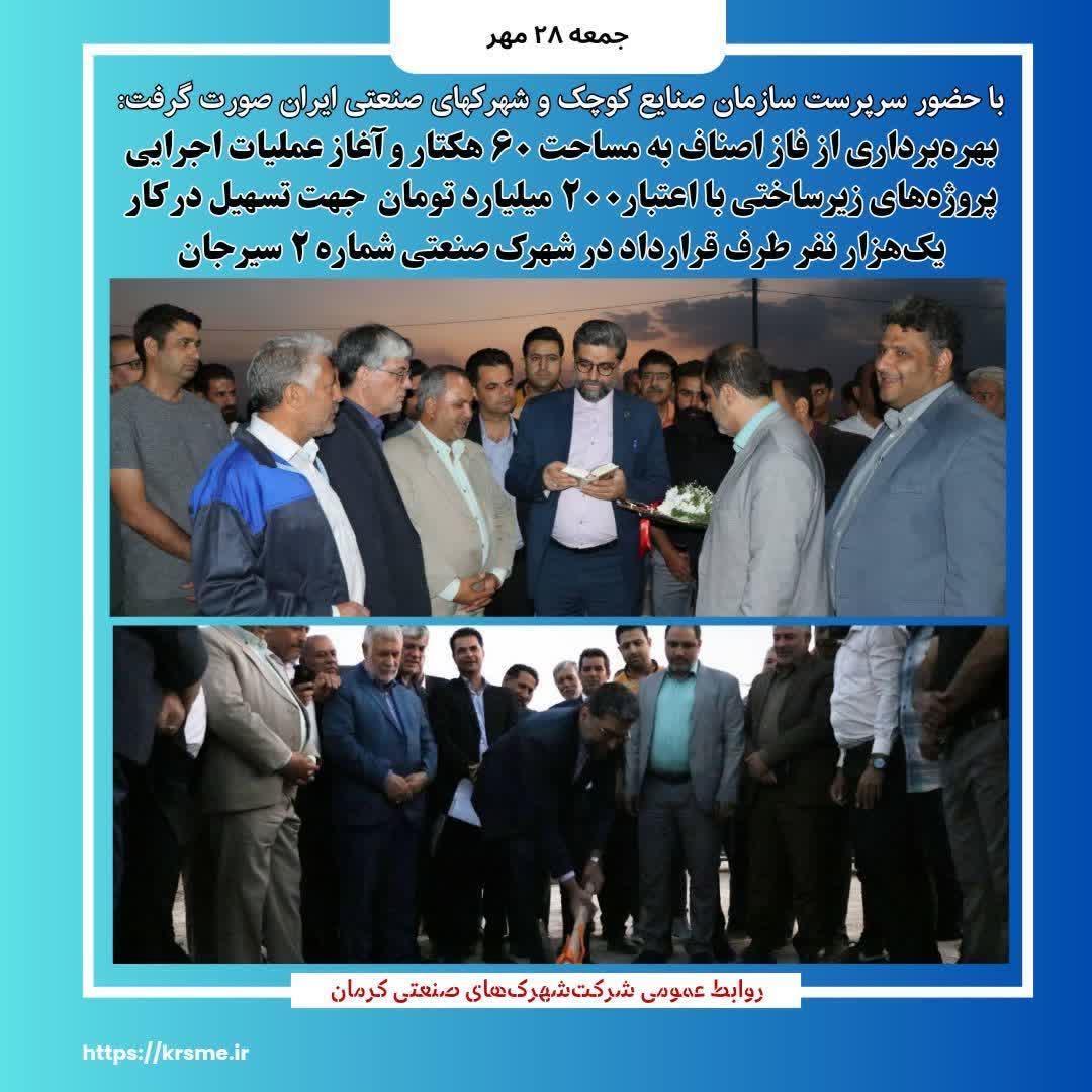 با حضور سرپرست سازمان صنایع کوچک و شهرکهای صنعتی ایران در جریان سفر به استان کرمان، فاز اصناف به مساحت ۶۰ هکتار در شهرک صنعتی شماره ۲ سیرجان مورد بهره برداری قرار گرفت و عملیات اجرایی پروژه های زیرساختی با اعتبار۲۰۰ میلیارد تومان جهت تسهیل در کار یک هزار نفر طرف قرارداد در این شهرک صنعتی آغاز شد.