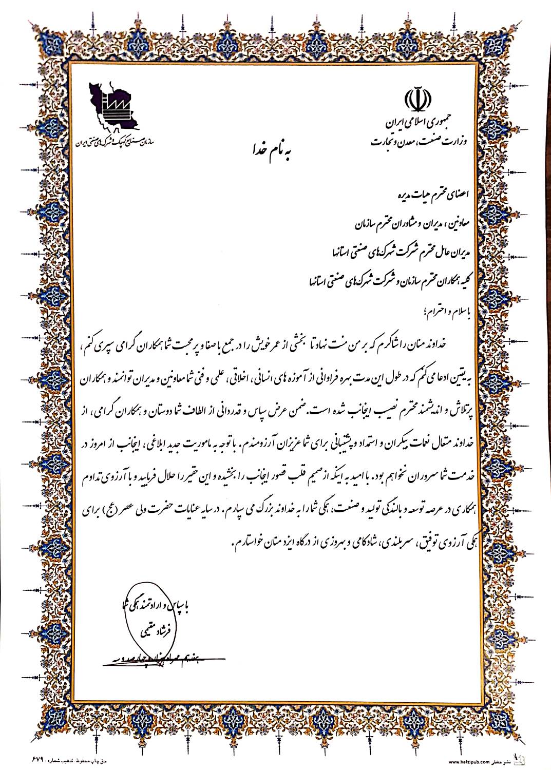 خداوند منان را شاکرم که بر من منت نهاد تا بخشی از عمر خویش را در جمع با صفا و پر محبت شما همکاران گرامی سپری کنم، به یقین ادعا میکنم که در طول این مدت بهره فراوانی از آموزه های انسانی، اخلاقی، علمی و فنی شما معاونین و مدیران توانمند و همکاران پرتلاش و اندیشمند محترم نصیب اینجانب شده است. ضمن عرض سپاس و قدردانی از الطاف شما دوستان و همکاران گرامی، از خداوند متعال نعمات بیکران و استمداد و پشتیبانی برای شما عزیزان آرزومندم. با توجه به ماموریت جدید ابلاغی، از امروز در خدمت شما سروران نخواهم بود. با امید به اینکه از صمیم قلب قصور اینجانب را بخشیده و این حقیر را حلال فرمایید و با آرزوی تداوم همکاری در عرصه توسعه و بالندگی تولید و صنعت، همگی شما را به خداوند بزرگ می سپارم.