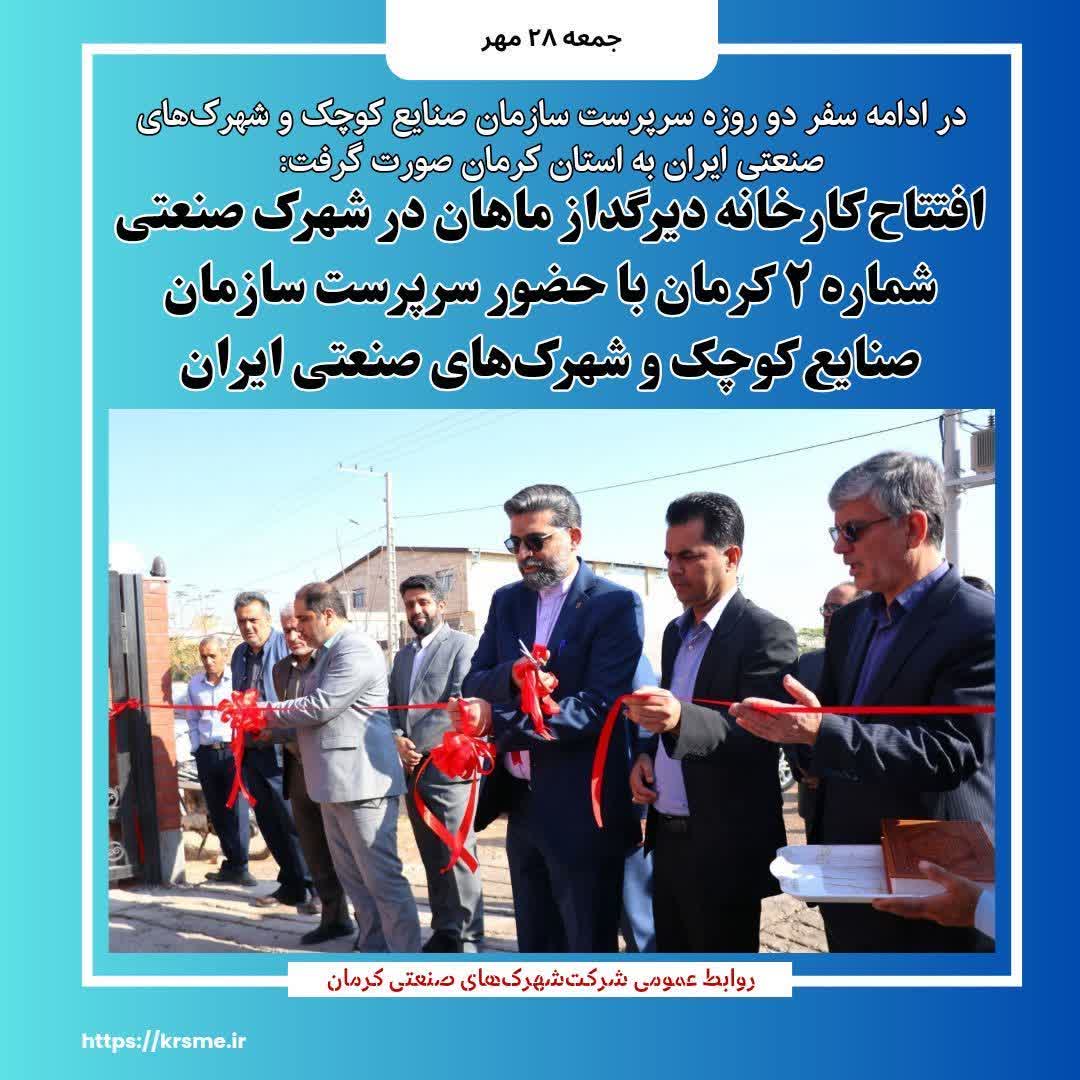 سرپرست سازمان صنایع کوچک و شهرک‌های صنعتی ایران در ادامه سفر دو روزه به استان کرمان کارخانه دیرگداز ماهان در شهرک صنعتی شماره ۲ کرمان را مورد افتتاح قرار داد.